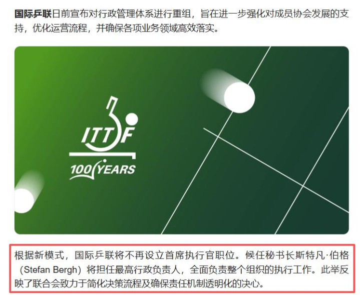 3月3日,国际乒联雅致官宣了一项重磅架构迂回,径直肆虐了乒坛原有的权力模式,径直取消了首席现实官这个职位,把统统最高行政职责,王人备交给了候任通知长斯特凡·伯格,相等于把权力透顶聚首到了通知长手中。