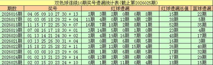 安队第2026026期双色球遗漏分析:(热码:遗漏0-3期,温码遗漏4-9期,冷码遗漏10期及以上)