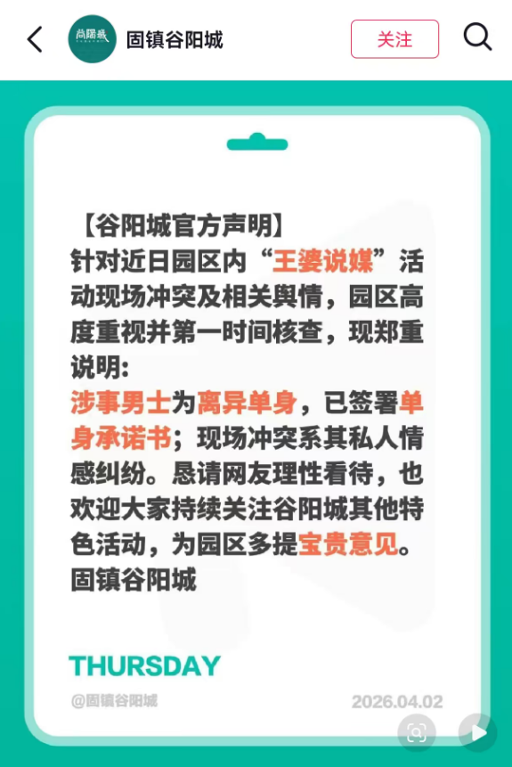 安徽固镇县谷阳城管事公园樱花圃运营方安徽省地面谷阳文化传媒有限公司4月2日发布声明称,针对近日园区内“王婆说媒”动作现场突破及干系舆情,园区高度喜爱并第一本领核查。涉事男士为离婚未婚,已签署未婚应承书,现场突破系其私情面感纠纷。