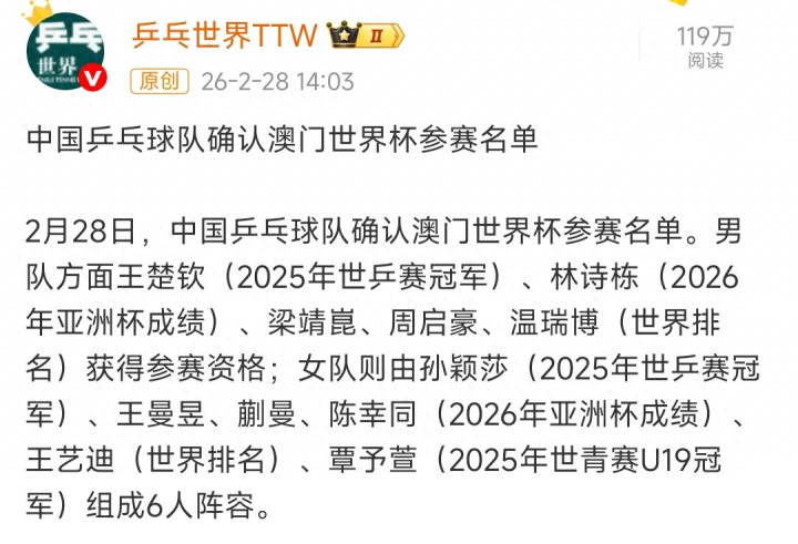 凭据国乒栽种组给出信息,女队方面,6名选手均通过不同渠谈取得阅历:孙颖莎和覃予萱分袂凭借2025年多哈世乒赛和2025年世青赛U19冠军径直入围,王曼昱、蒯曼、陈幸同依托2026年海口亚洲杯收成晋级,王艺迪则依靠寰球名次锁定席位。
