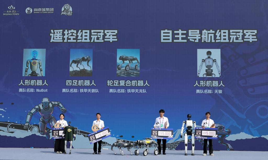 4月19日,机器东谈主能人挑战赛遥控组冠军和自主导航组冠军在授奖典礼上合影。新华社记者 张晨霖 摄