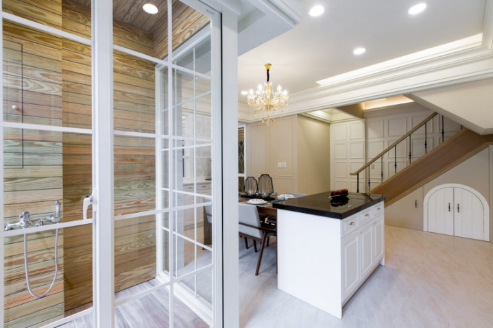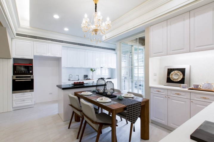 中岛厨景:白皙橱柜与黑石台面呼应,勾画澄清俐落的烹调场域。