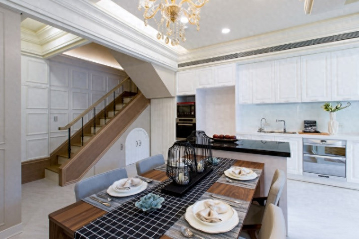 餐桌语境:木质桌面搭配华好意思吊灯,营造温馨而具庆典感的用餐氛围。