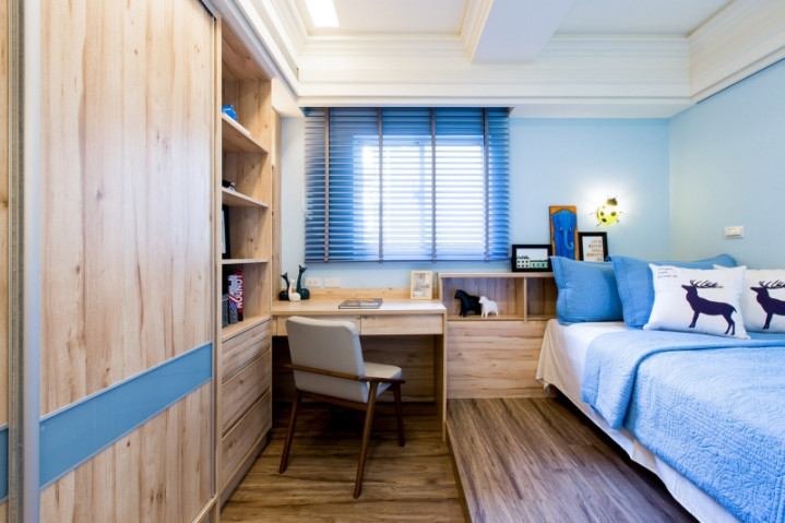 崭新童房:当然木纹与柔和蓝调并陈,打造千里静亲切的成漫空间。