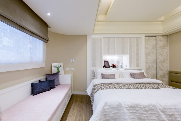 {jz:field.toptypename/}千里静主卧:米白立面与精细线板交汇,构筑恣意的卧眠氛围。