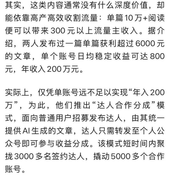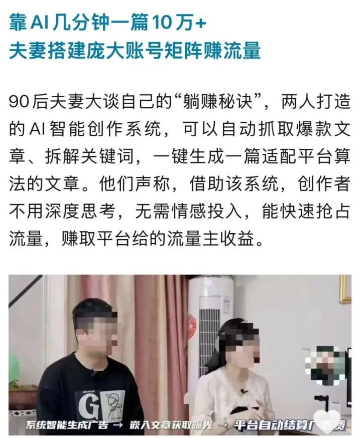 最近,一双90后爱妻用AI器具批量分娩本色,几分钟就能生成一篇投合平台算法“口味”的公众号著作以赚取流量收益,此事激发世俗热心。两东说念主还对外引申这套交易模式,通过“达东说念主配合分红”模式撬动数千账号矩阵。