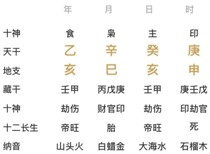 坤造:乙亥年,辛巳月,癸亥日,庚申时(子丑空)