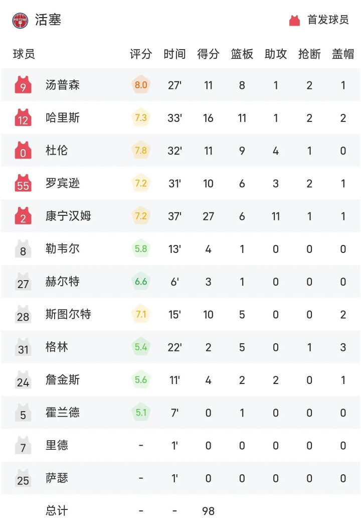 记载二:坎宁安季后赛生活前8场比赛一说念得分20+。坎宁安本场砍下27分11助 季后赛生活第4次至少20分10助。康宁汉姆本场延续了可以情景,全场出战37分钟,19投11中,三分6中1,得到27分11助攻6篮板1抢断1盖帽,填满数据栏,正负值是+17。康宁汉姆在我方得分的同期,也周转了全队的庞大,带队强势扳平大比分。本场比赛是康宁汉姆生活第2次季后赛砍下25分+10助攻,就此升至活塞队史第二多,仅次于“浅笑刺客”托马斯的10次。