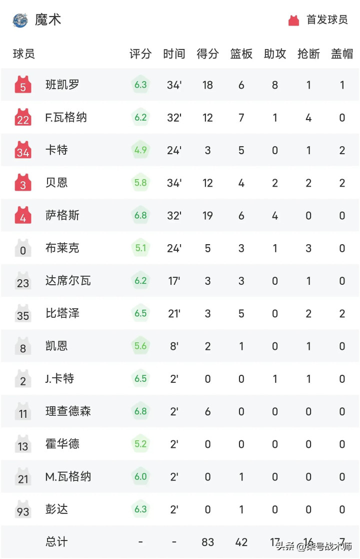 记载三:从第三节初始到4分20秒的时间节点,活塞轰出一波离谱的30-3超等抨击波!比赛径直打花。极致醒目,83分为魔术本赛季单场得分新低,此前最低是87分。